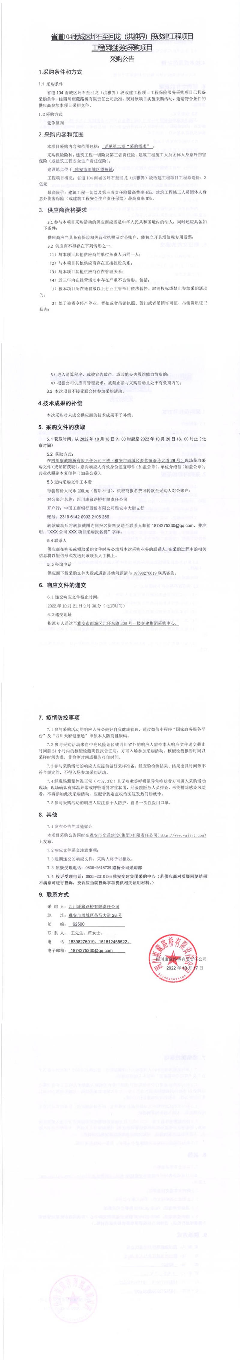 四川康藏路橋有限責(zé)任公司省道104雨城區(qū)坪石至回龍(洪雅界)段改建工程項目工程保險服務(wù)采購項目采購公告