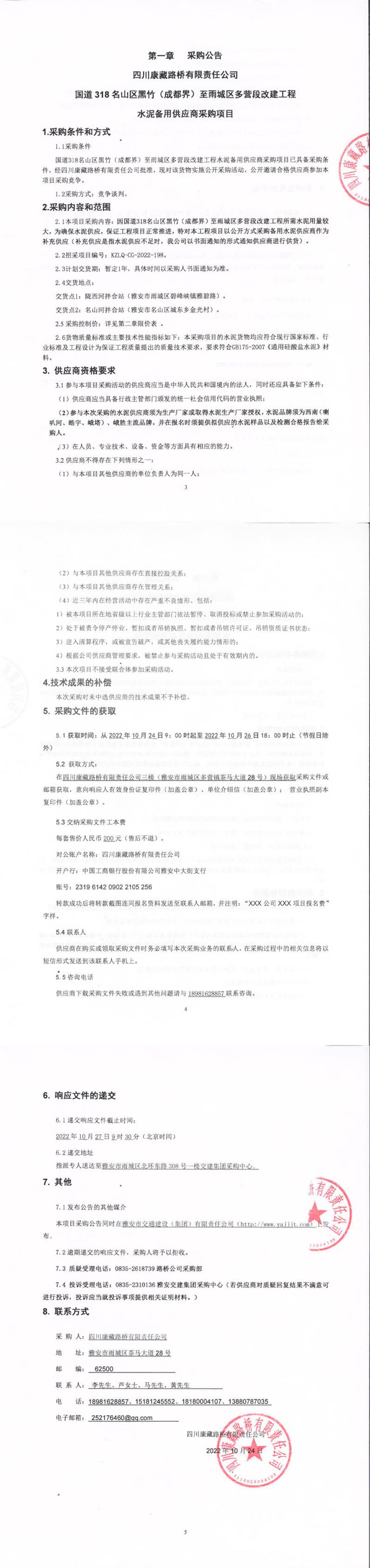 四川康藏路橋有限責任公司國道318名山區(qū)黑竹(成都界)至雨城區(qū)多營段改建工程水泥備用供應(yīng)商采購項目補遺書(一)