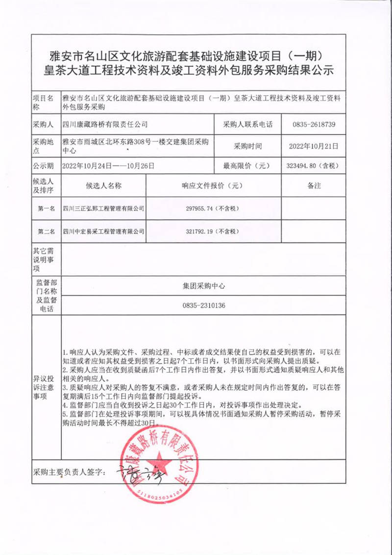 四川康藏路橋有限責(zé)任公司雅安市名山區(qū)文化旅游配套基礎(chǔ)設(shè)施建設(shè)項目(一期)皇茶大道工程技術(shù)資料及竣工資料外包服務(wù)采購結(jié)果公示