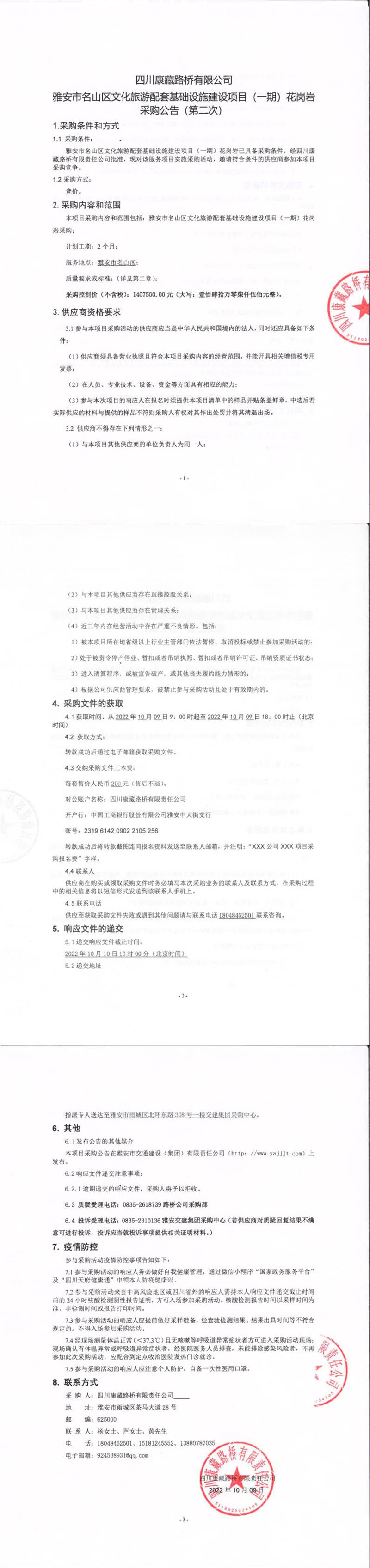 四川康藏路橋有限責(zé)任公司雅安市名山區(qū)文化旅游配套基礎(chǔ)設(shè)施建設(shè)項目(一期)花崗巖采購公告(第二次)