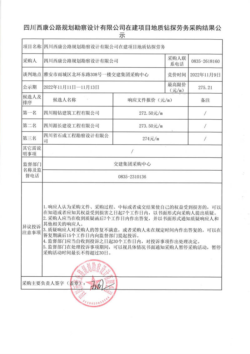 四川西康公路規(guī)劃勘察設(shè)計有限公司在建項目地質(zhì)鉆探勞務(wù)采購結(jié)果公示