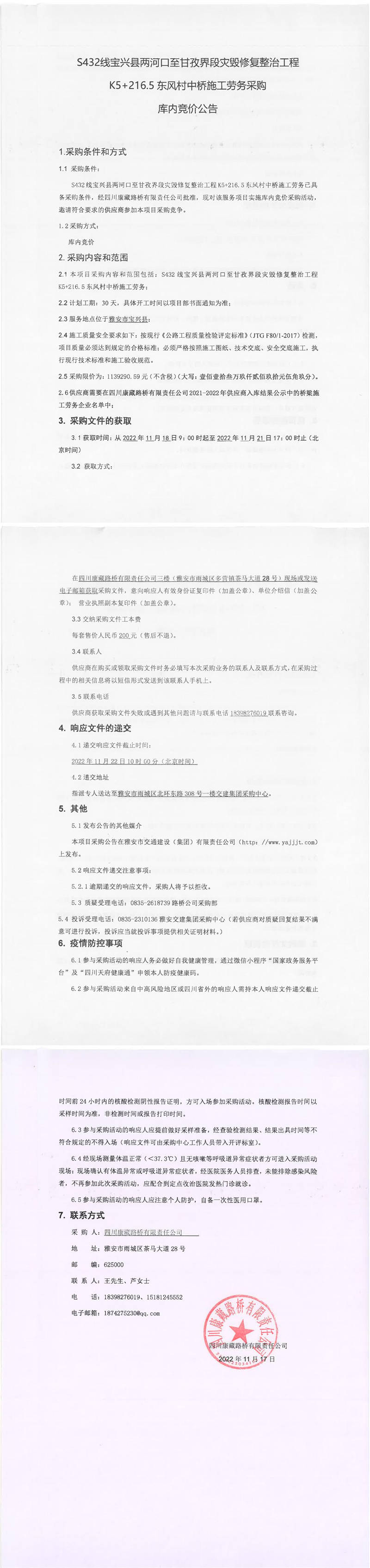 四川康藏路橋有限責(zé)任公司S432線寶興縣兩河口至甘孜界段災(zāi)毀修復(fù)整治工程K5+216.5東風(fēng)村中橋施工勞務(wù)采購(gòu)庫(kù)內(nèi)競(jìng)價(jià)公告