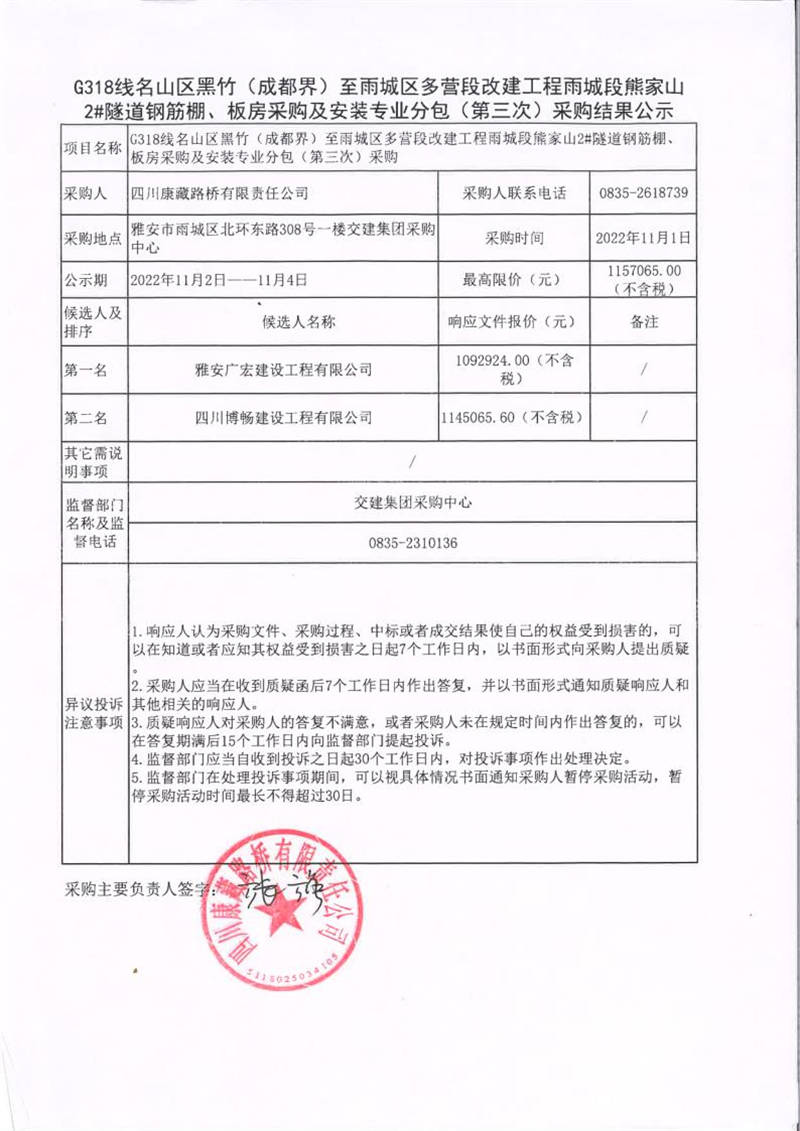 四川康藏路橋有限責(zé)任公司G318線名山區(qū)黑竹(成都界)至雨城區(qū)多營段改建工程雨城段熊家山2#隧道鋼筋棚、板房采購及安裝專業(yè)分包(第三次)采購結(jié)果公示