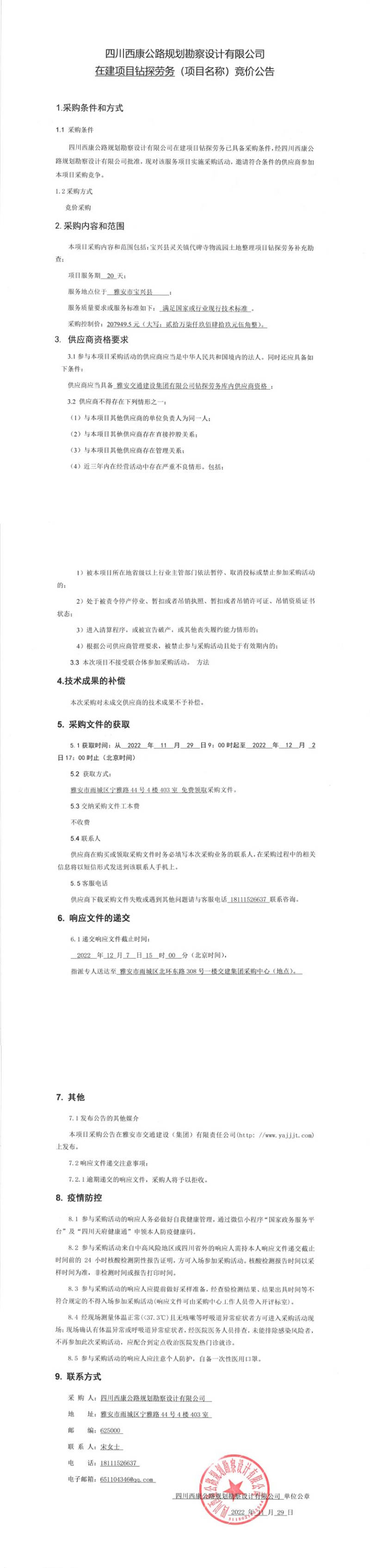 四川西康公路規(guī)劃勘察設(shè)計(jì)有限公司在建項(xiàng)目鉆探勞務(wù)競價(jià)公告