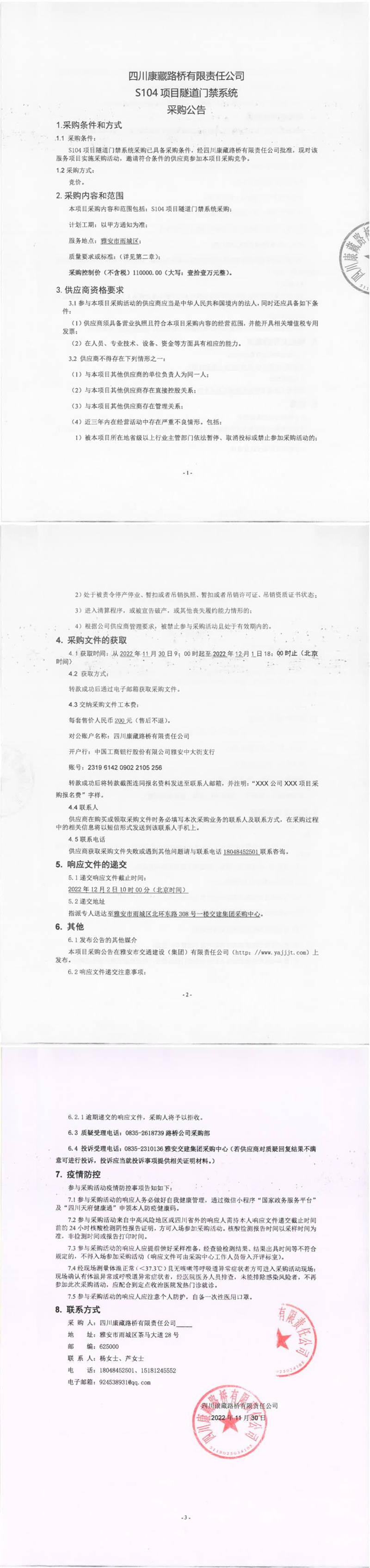 四川康藏路橋有限責(zé)任公司S104項(xiàng)目隧道門禁系統(tǒng)采購公告