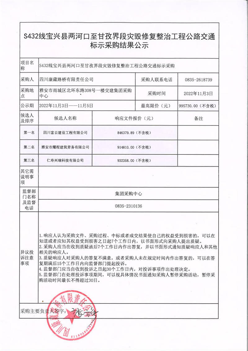 四川康藏路橋有限責任公司S432線寶興縣兩河口至甘孜界段災毀修復整治工程公路交通標示采購結(jié)果公示