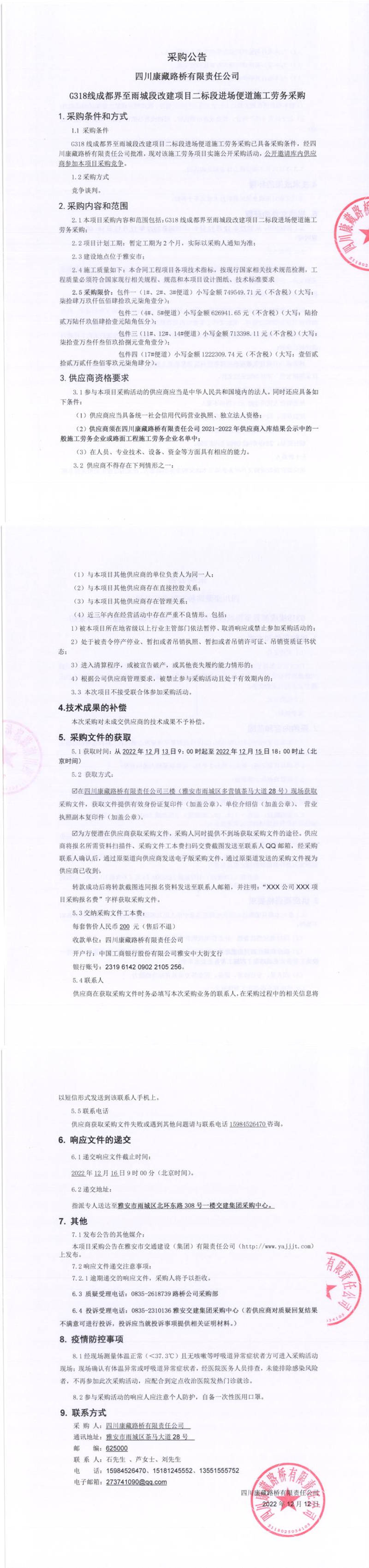四川康藏路橋有限責(zé)任公司G318線成都界至雨城段新改建項(xiàng)目二標(biāo)段進(jìn)場便道施工勞務(wù)采購公告