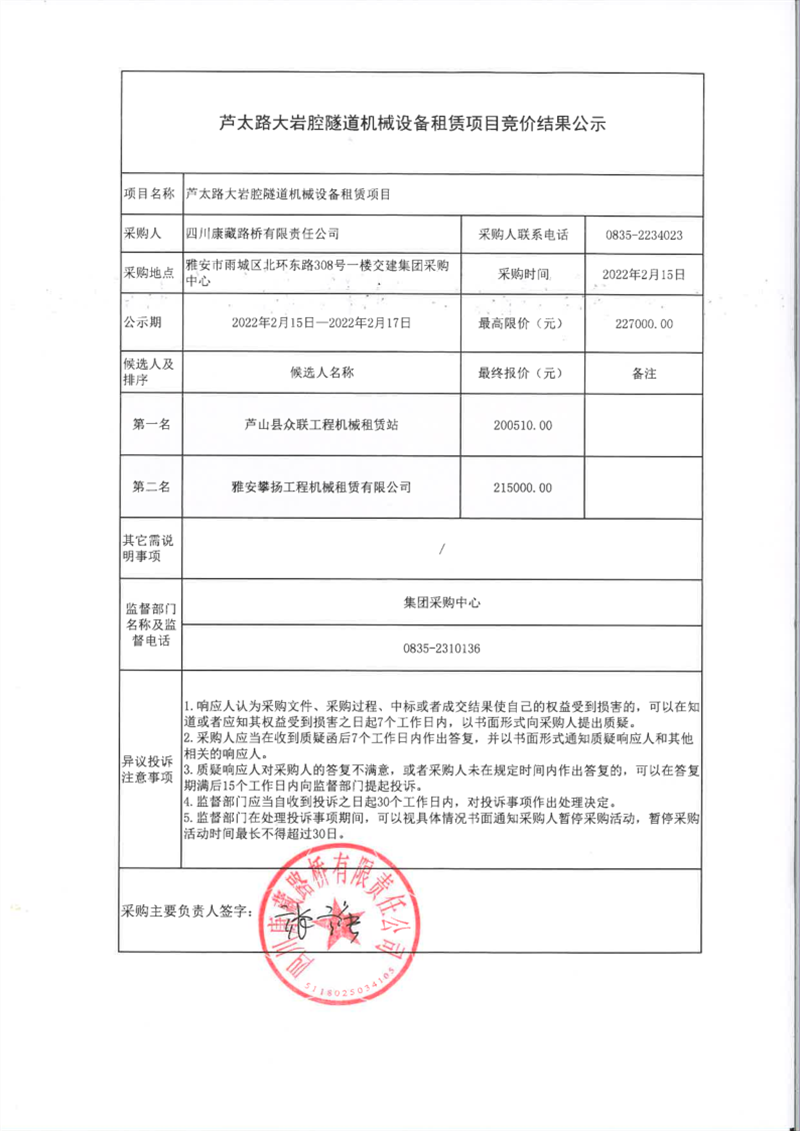 四川康藏路橋有限責(zé)任公司蘆太路大巖腔隧道機(jī)械設(shè)備租賃項目競價結(jié)果公示