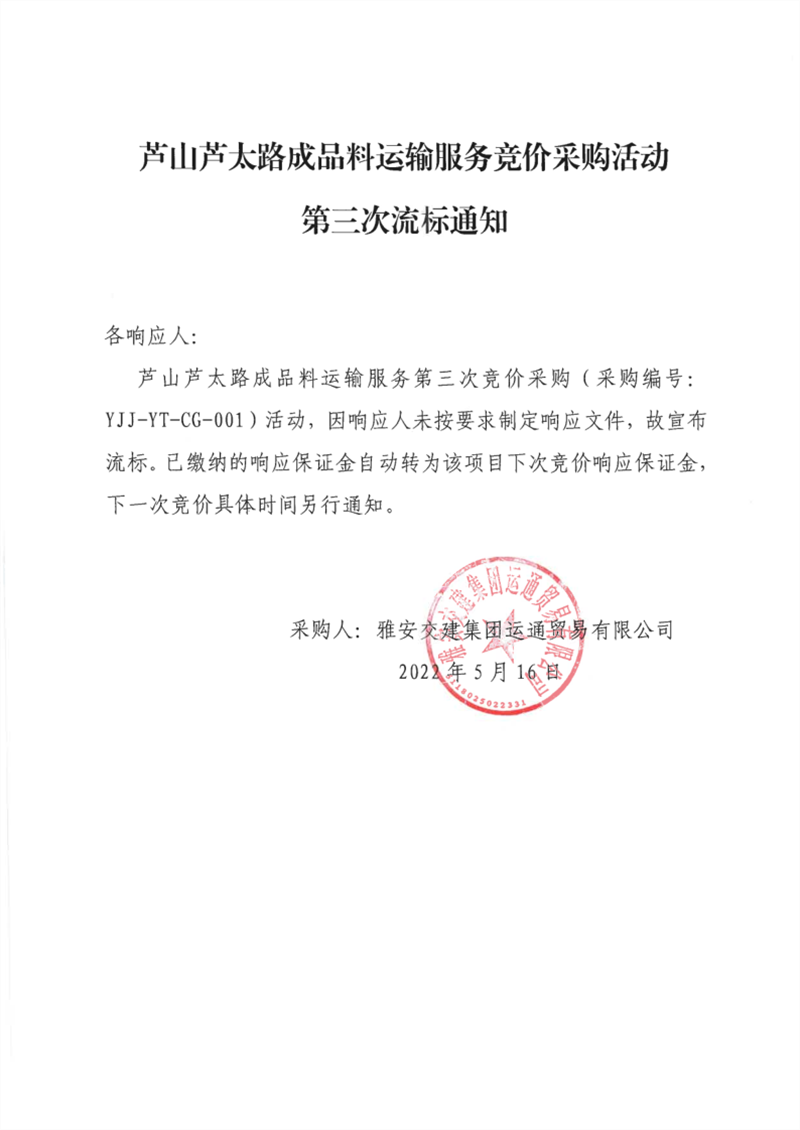 雅安交建集團(tuán)運(yùn)通貿(mào)易有限公司蘆山蘆太路成品料運(yùn)輸服務(wù)競(jìng)價(jià)采購(gòu)活動(dòng)第三次流標(biāo)通知
