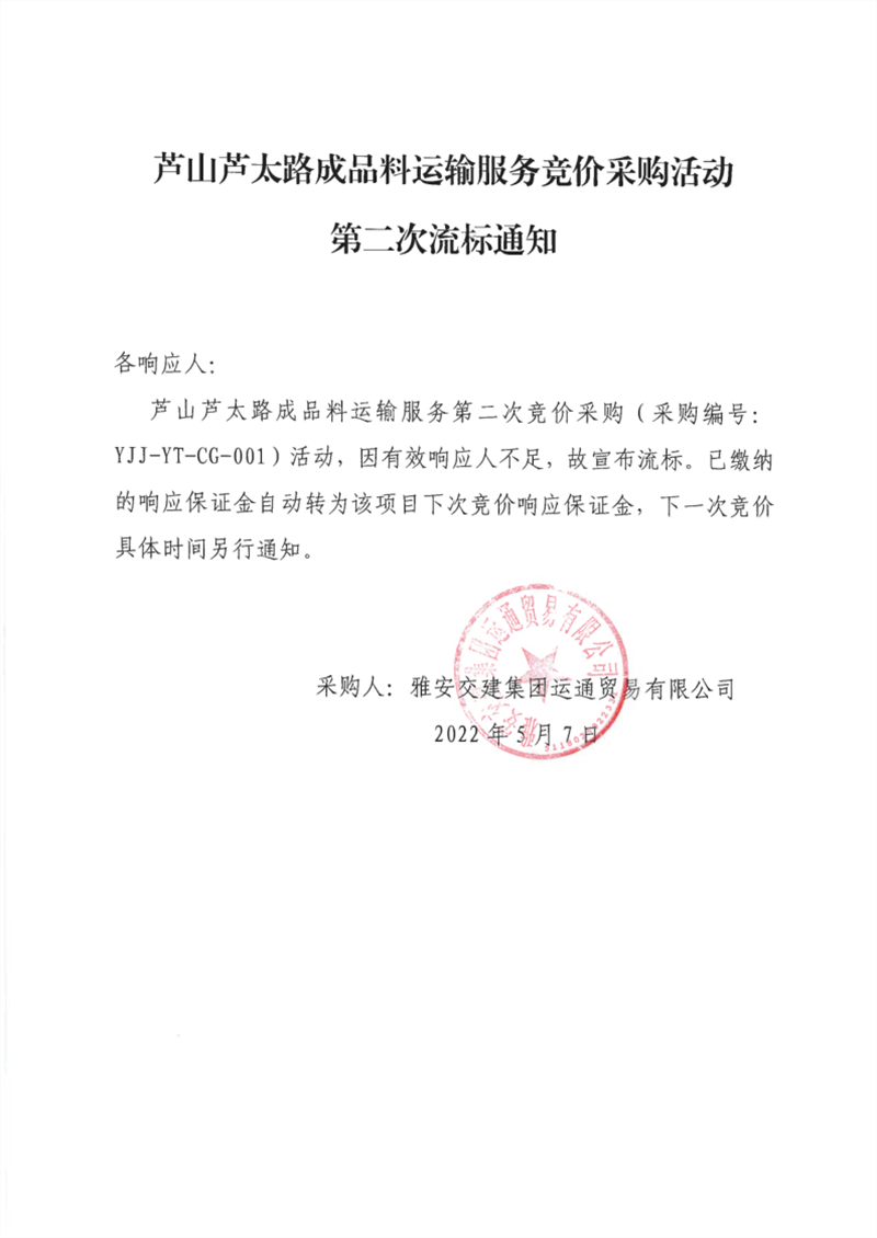 雅安交建集團運通貿(mào)易有限公司蘆山蘆太路成品料運輸服務(wù)競價采購活動第二次流標(biāo)通知