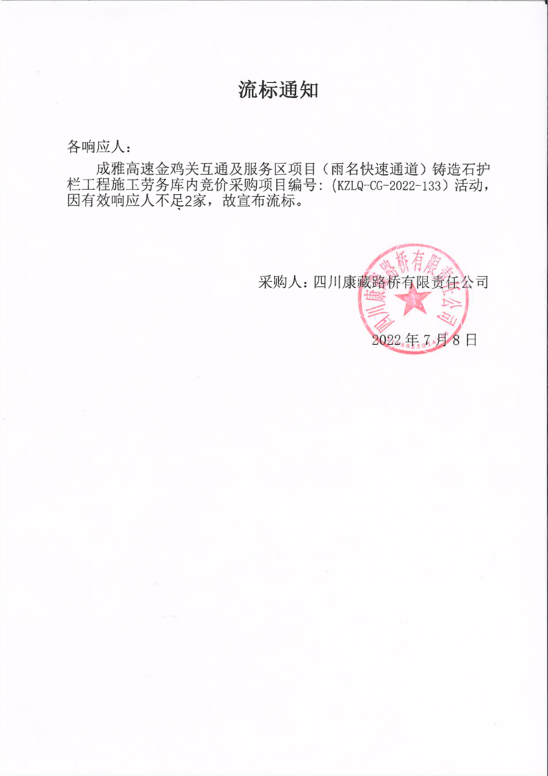 四川康藏路橋有限責(zé)任公司成雅高速金雞關(guān)互通及服務(wù)區(qū)項(xiàng)目(雨名快速通道)鑄造石護(hù)欄施工勞務(wù)庫內(nèi)競價(jià)采購項(xiàng)目流標(biāo)通知