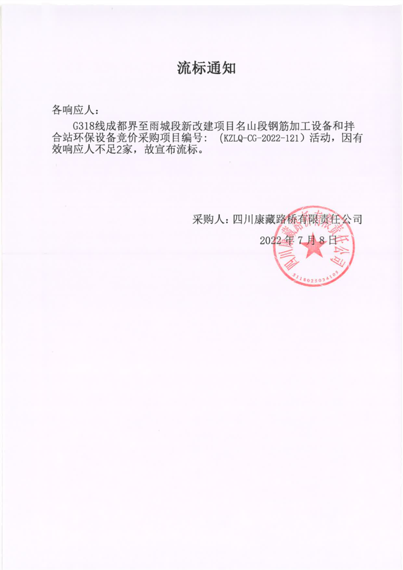四川康藏路橋有限責(zé)任公司G318線成都界至雨城段新改建項(xiàng)目名山段鋼筋加工設(shè)備和拌合站環(huán)保設(shè)備競價(jià)采購項(xiàng)目流標(biāo)通知
