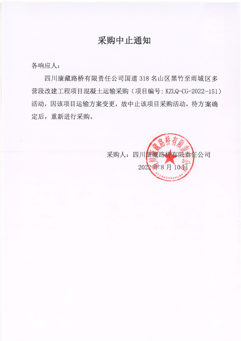 四川康藏路橋有限責(zé)任公司國道318名山區(qū)黑竹至雨城區(qū)多營段改建工程項目混凝土運(yùn)輸采購中止通知