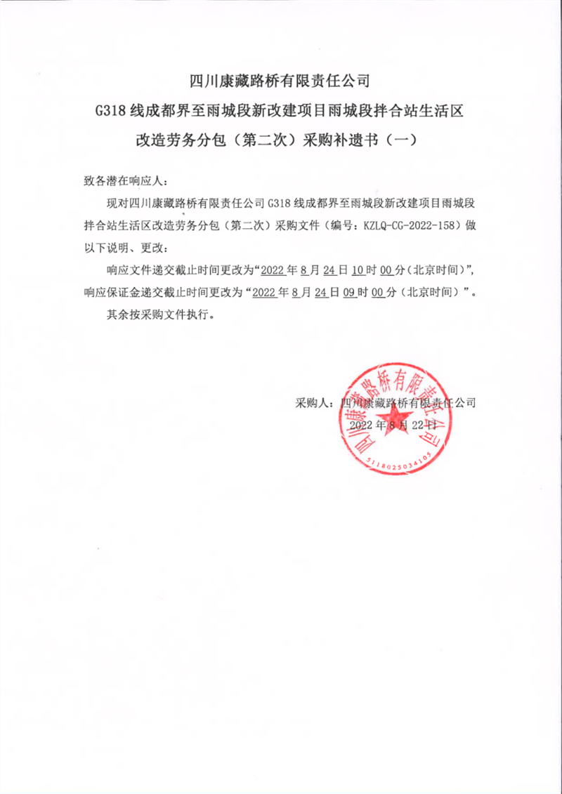四川康藏路橋有限責(zé)任公司G318線成都界至雨城段新改建項(xiàng)目雨城段拌合站生活區(qū)改造勞務(wù)分包(第二次)采購(gòu)補(bǔ)遺書(一)
