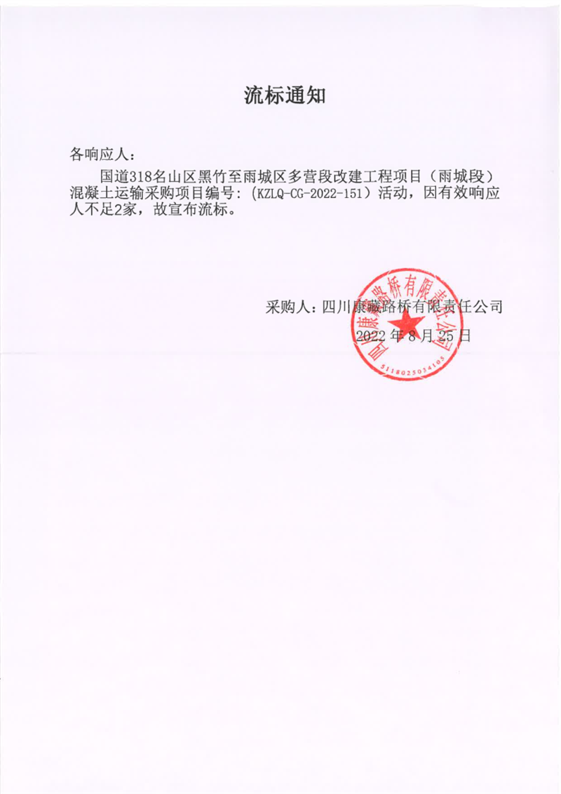 四川康藏路橋有限責任公司國道318名山區(qū)黑竹至雨城區(qū)多營段改建工程項目(雨城段)混凝土運輸采購項目流標通知