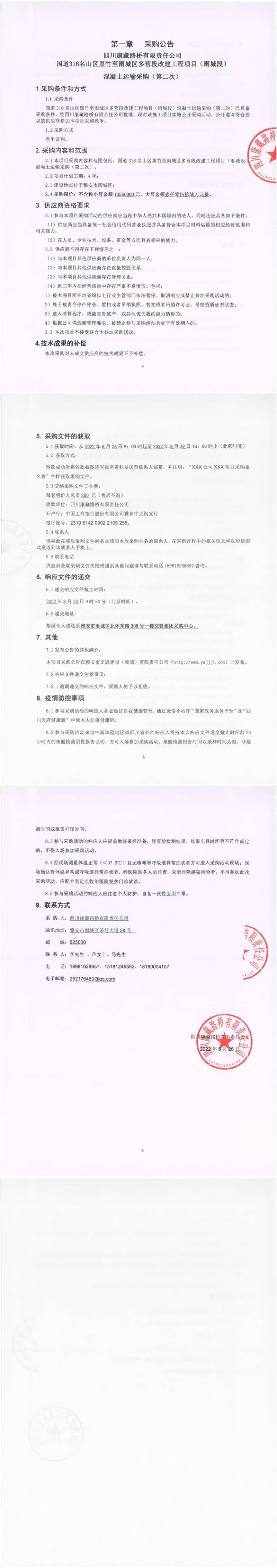 四川康藏路橋有限責(zé)任公司國(guó)道318名山區(qū)黑竹至雨城區(qū)多營(yíng)段改建工程項(xiàng)目(雨城段)混凝土運(yùn)輸(第二次)采購(gòu)公告