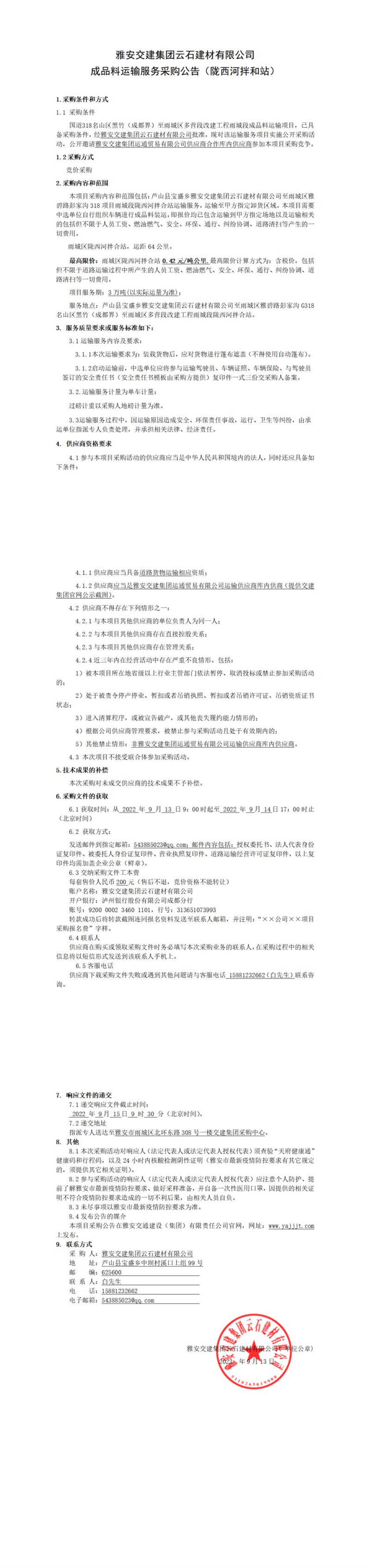 雅安交建集團(tuán)云石建材有限公司成品料運(yùn)輸服務(wù)采購(gòu)公告(皇茶大道拌和站)