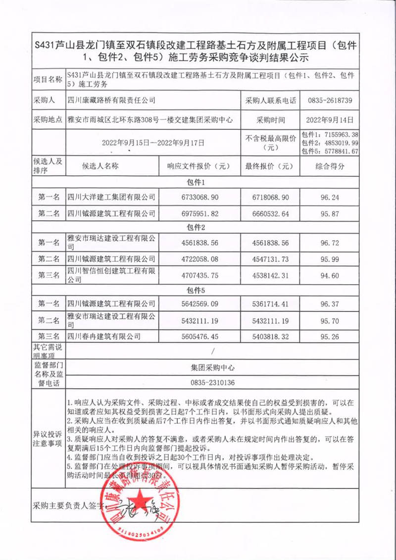 四川康藏路橋有限責任公司S431蘆山縣龍門鎮(zhèn)至雙石鎮(zhèn)段改建工程路基土石方及附屬工程項目(包件1、包件2、包件5)施工勞務采購競爭談判結果公示