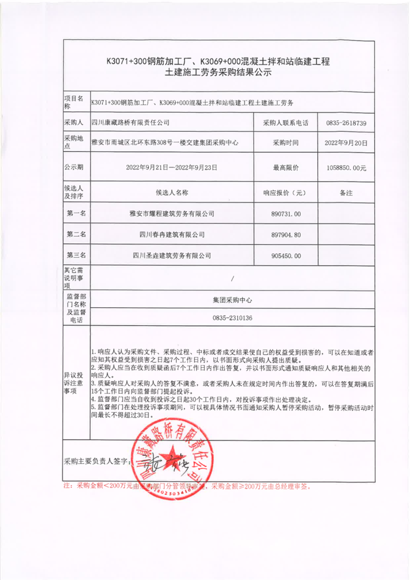 四川康藏路橋有限責(zé)任公司K3071+300鋼筋加工廠、K309+000混凝土拌和站臨建工程土建施工勞務(wù)采購結(jié)果公示