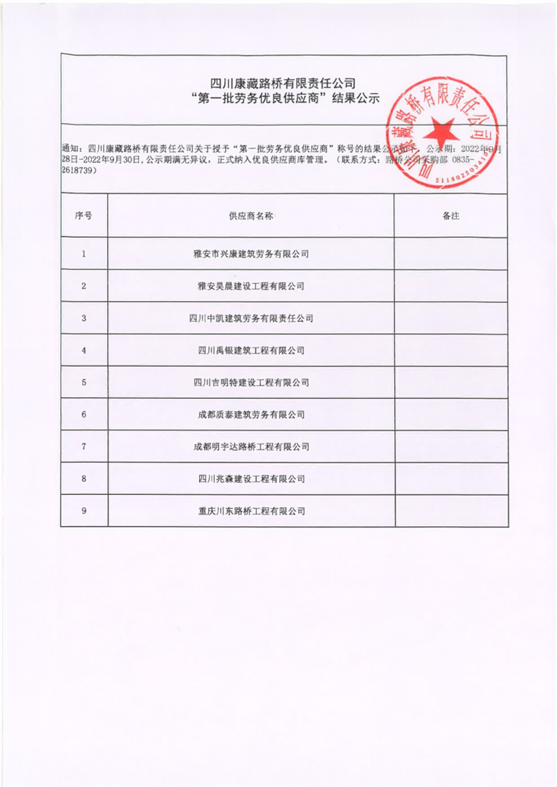 四川康藏路橋有限責任公司“第一批勞務優(yōu)良供應商”結果公示