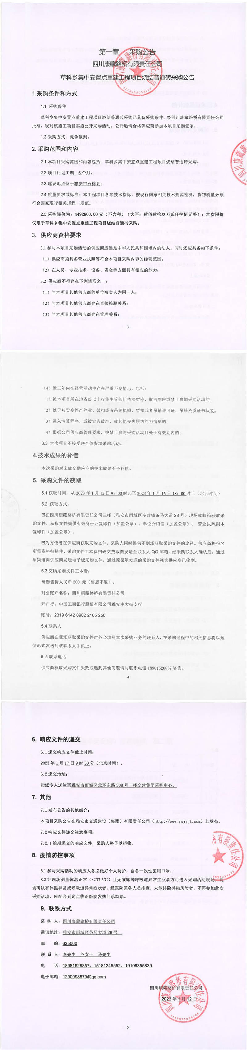 四川康藏路橋有限責(zé)任公司石棉草科鄉(xiāng)集中安置點(diǎn)重建工程項目燒結(jié)普通磚采購公告