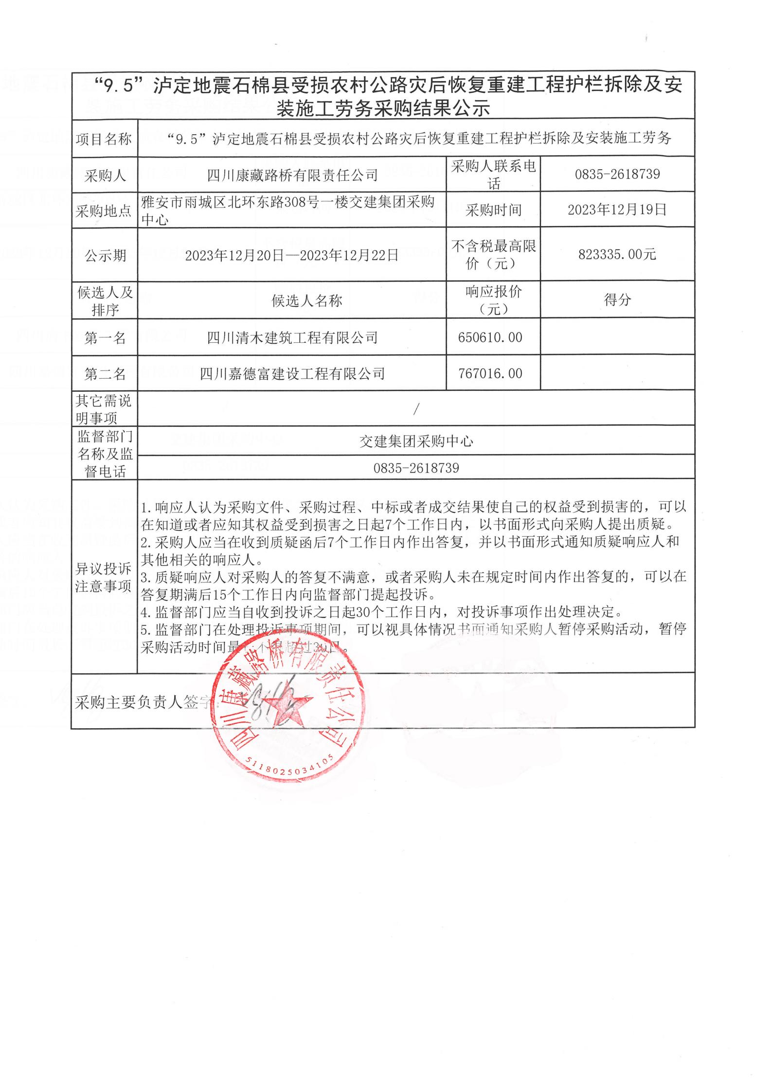 四川康藏路橋有限責任公司“9.5”瀘定地震石棉縣受損農(nóng)村公路災后恢復重建工程護欄拆除及安裝施工勞務采購結果公示