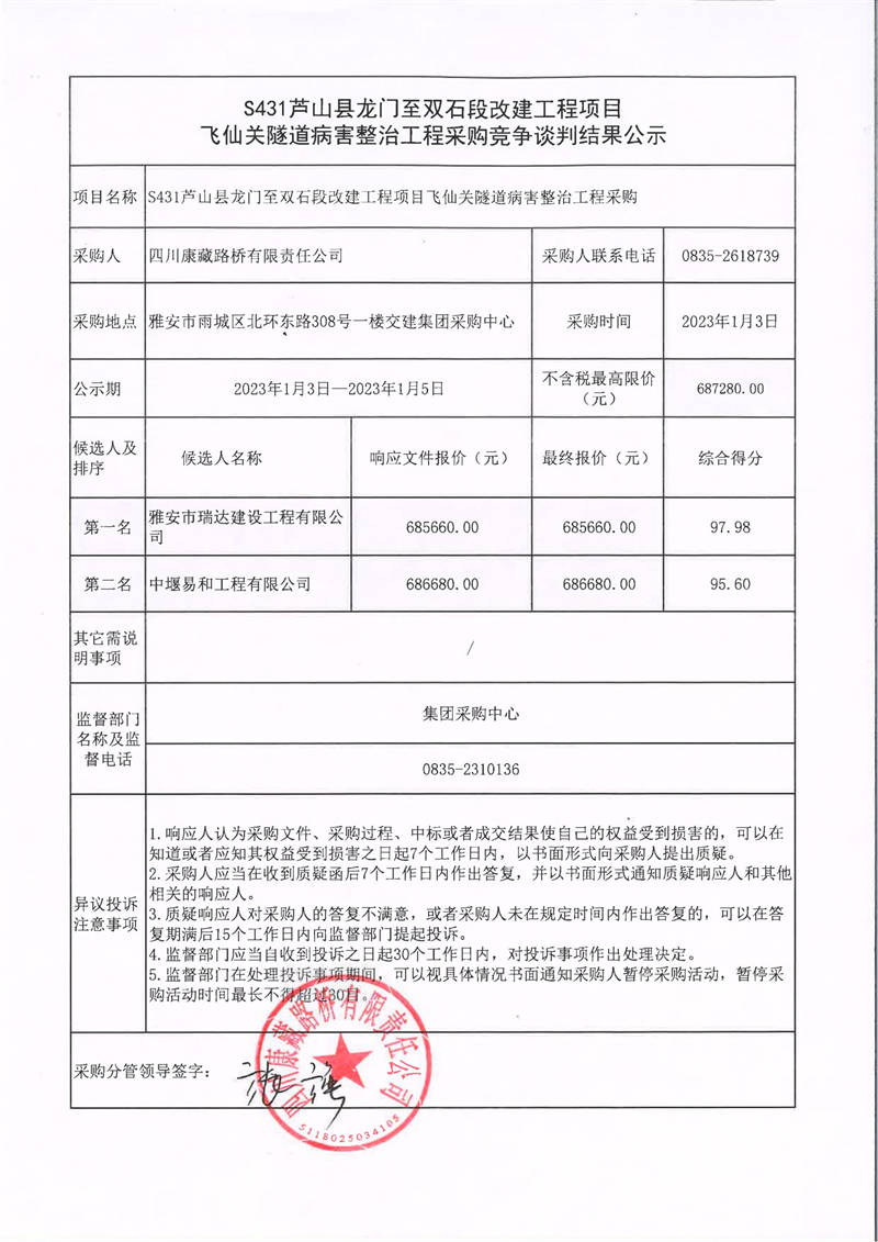 四川康藏路橋有限責(zé)任公司S431蘆山縣龍門至雙石段改建工程項目飛仙關(guān)隧道病害整治工程采購競爭談判結(jié)果公示