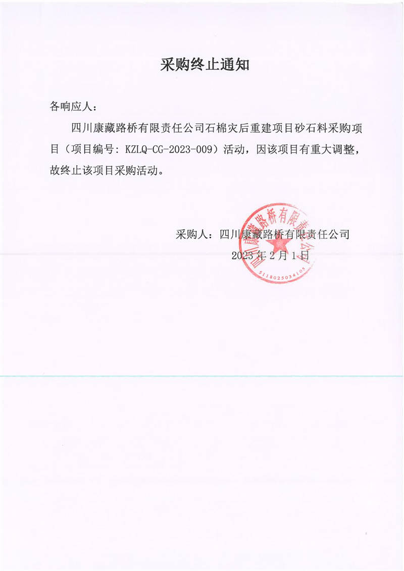 四川康藏路橋有限責任公司石棉災后重建項目砂石料采購項目采購終止通知
