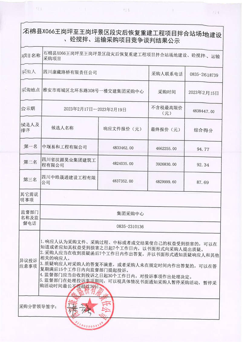 四川康藏路橋有限責(zé)任公司石棉縣X066王崗坪至王崗坪景區(qū)段災(zāi)后恢復(fù)重建工程項(xiàng)目拌合站場(chǎng)地建設(shè)、砼攪拌、運(yùn)輸采購項(xiàng)目競(jìng)爭談判結(jié)果公示