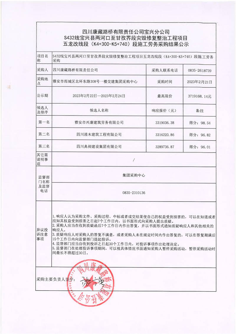 四川康藏路橋有限責任公司寶興分公司S432寶興縣兩河口至甘孜界段災毀修復整治工程項目五龍改線段(K4+300-K5+740)段施工勞務(wù)采購結(jié)果公示