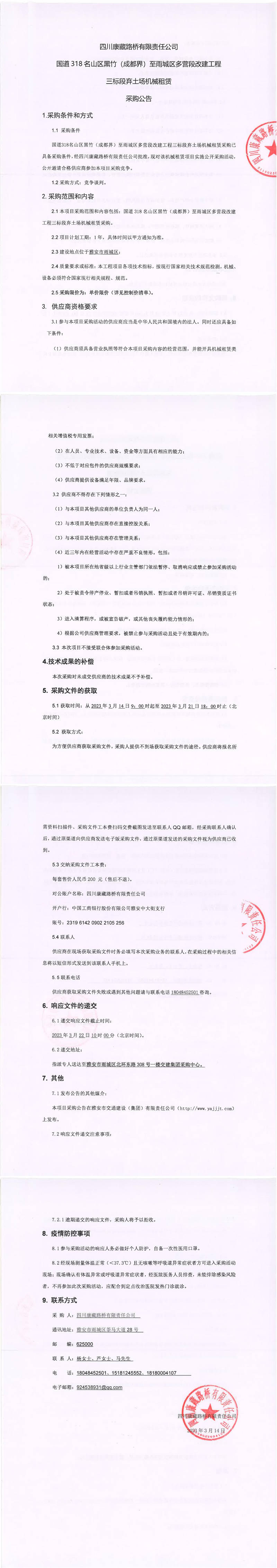 四川康藏路橋有限責(zé)任公司國道318名山區(qū)黑竹(成都界)至雨城區(qū)多營段改建工程三標(biāo)段棄土場機(jī)械租賃采購公告