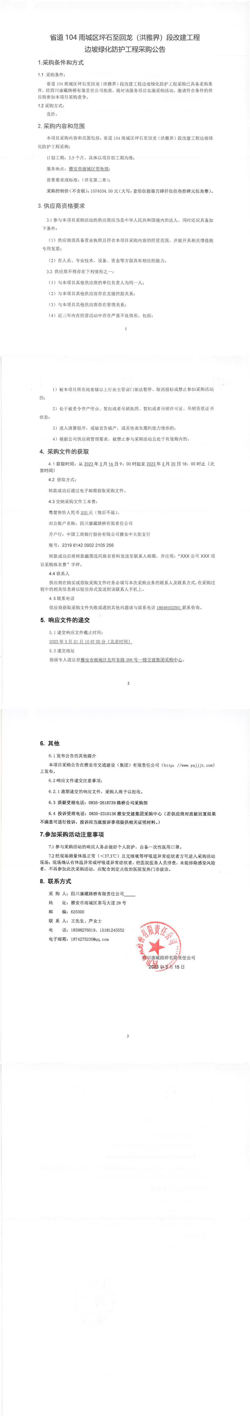 四川康藏路橋有限責(zé)任公司省道104雨城區(qū)坪石至回龍(洪雅界)段改建工程邊坡綠化防護(hù)工程采購公告