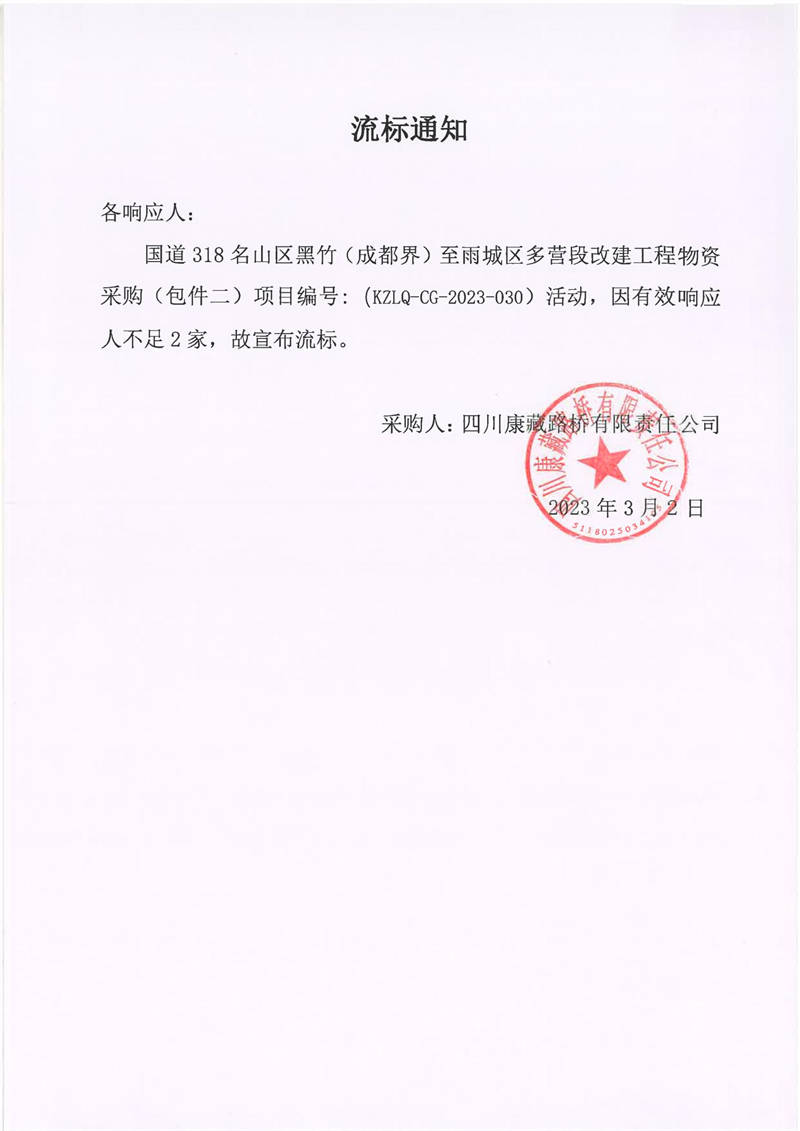 四川康藏路橋有限責任公司國道318名山區(qū)黑竹(成都界)至雨城區(qū)多營段改建工程物資采購包件2流標通知
