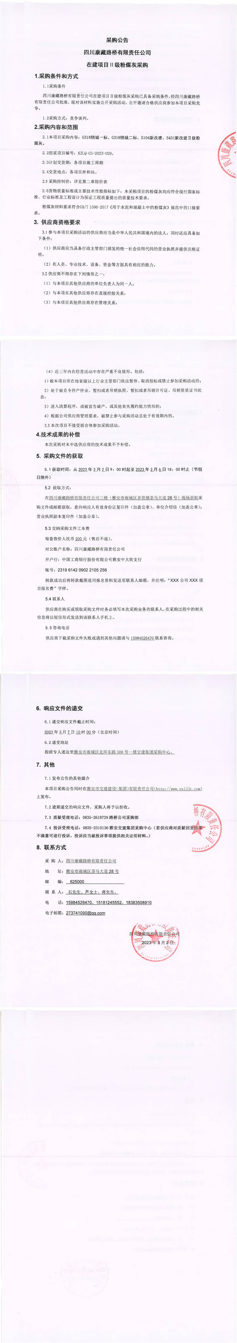 四川康藏路橋有限責(zé)任公司在建項(xiàng)目Ⅱ級粉煤灰采購公告