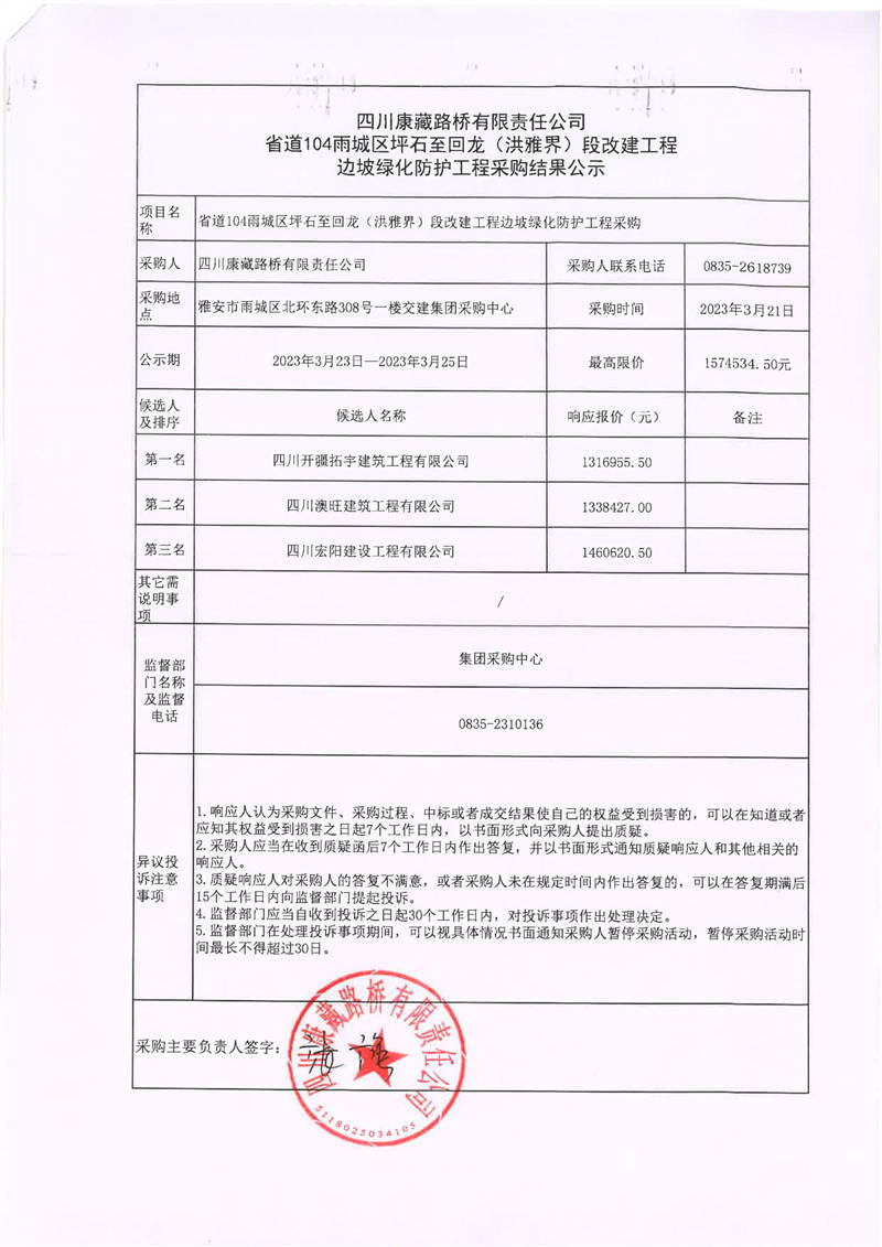 四川康藏路橋有限責(zé)任公司省道104雨城區(qū)坪石至回龍(洪雅界)段改建工程邊坡綠化防護(hù)工程采購結(jié)果公示