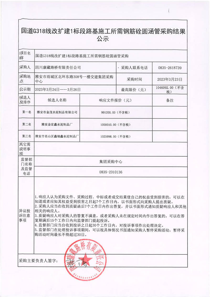 四川康藏路橋有限責任公司石國道G318擴建1標段路基施工所需鋼筋砼圓涵管采購結(jié)果公示