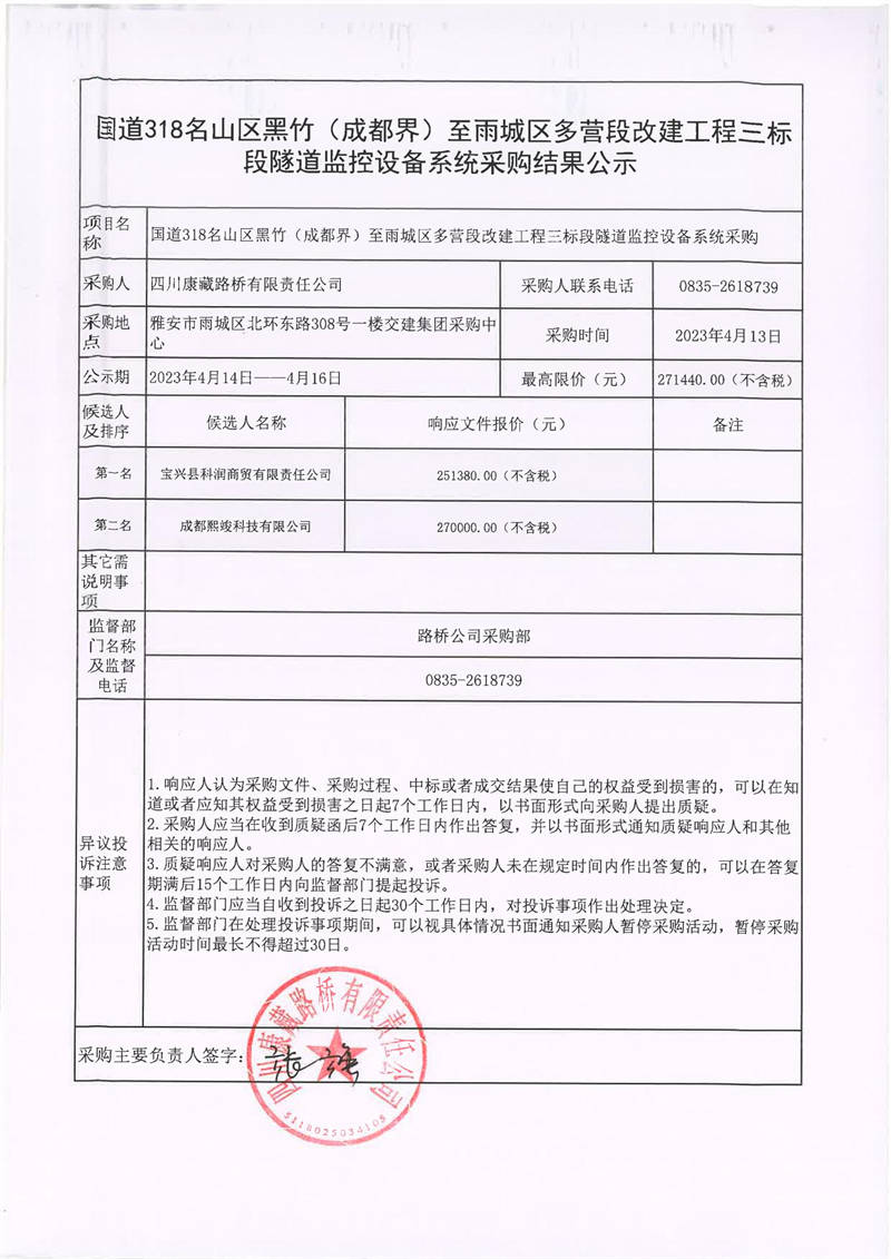 四川康藏路橋有限責任公司國道318名山區(qū)黑竹(成都界)至雨城區(qū)多營段改建工程三標段隧道監(jiān)控設備系統(tǒng)采購結果公示