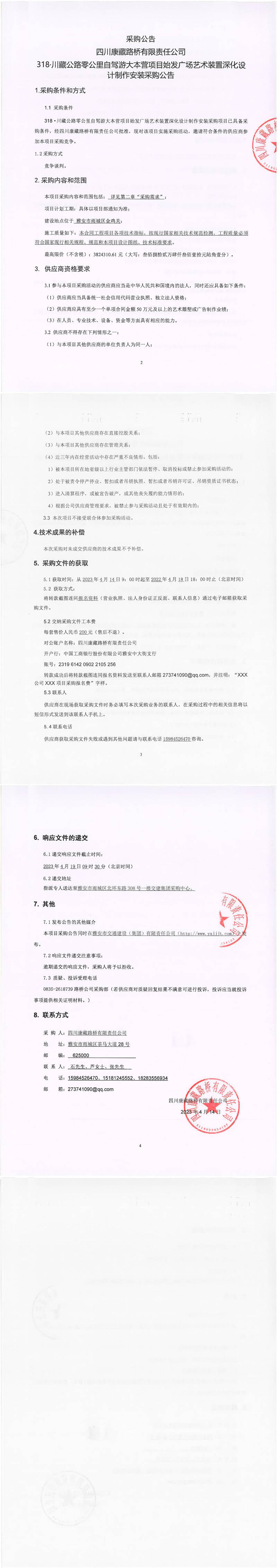 四川康藏路橋有限責任公司318·川藏公路零公里自駕游大本營項目始發(fā)廣場藝術(shù)裝置深化設(shè)計制作安裝采購公告