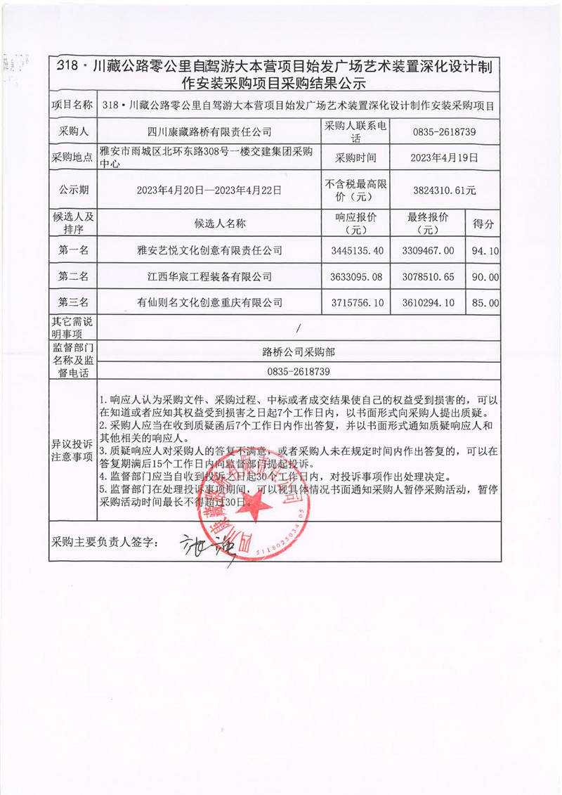 四川康藏路橋有限責(zé)任公司318·川藏公路零公里自駕游大本營(yíng)項(xiàng)目始發(fā)廣場(chǎng)藝術(shù)裝置深化設(shè)計(jì)制作安裝采購(gòu)項(xiàng)目采購(gòu)結(jié)果公示