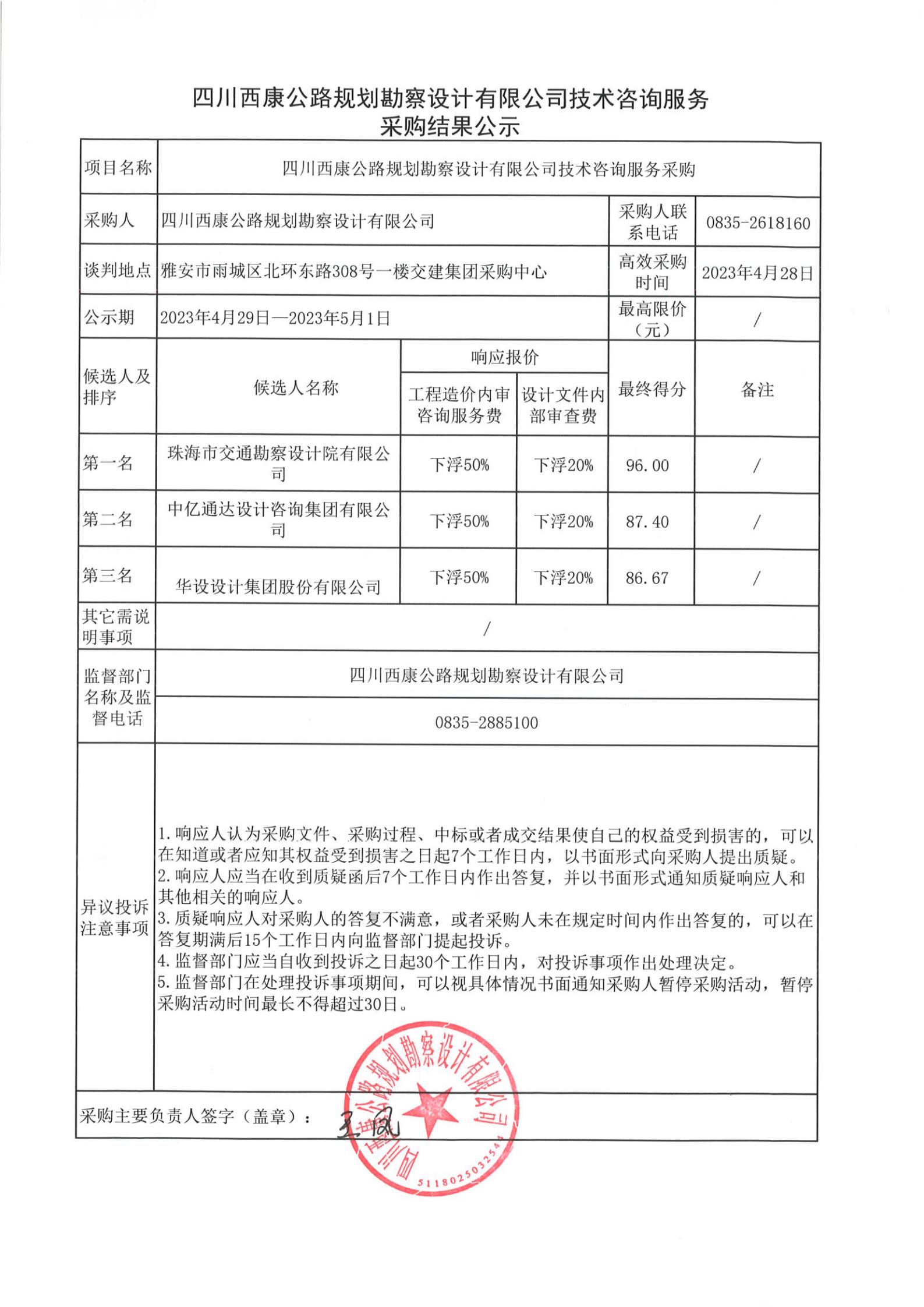 四川西康公路規(guī)劃勘察設計有限公司技術咨詢服務采購結果公示