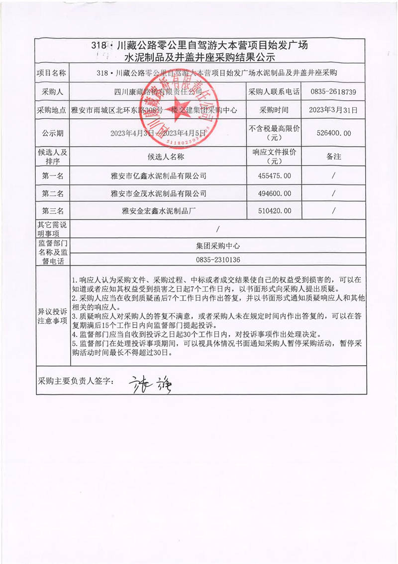 四川康藏路橋有限責(zé)任公司318·川藏公路零公里自駕游大本營(yíng)項(xiàng)目始發(fā)廣場(chǎng)水泥制品及井蓋井座采購(gòu)結(jié)果公示