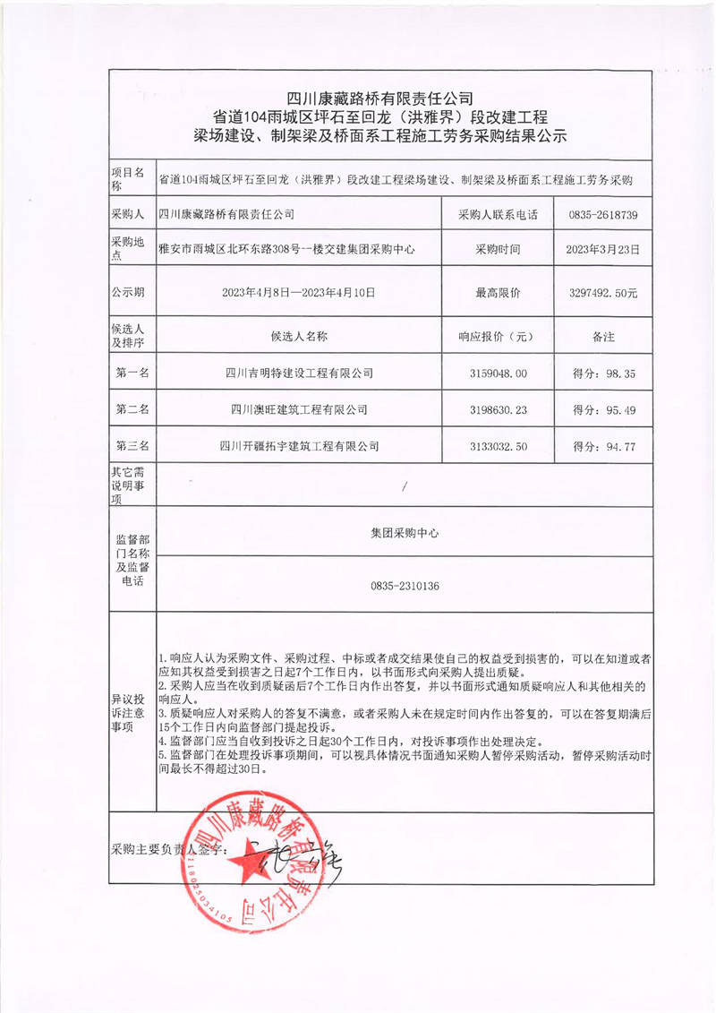四川康藏路橋有限責任公司省道104雨城區(qū)坪石至回龍(洪雅界)段改建工程梁場建設、制架梁及橋面系工程施工勞務采購結果公示