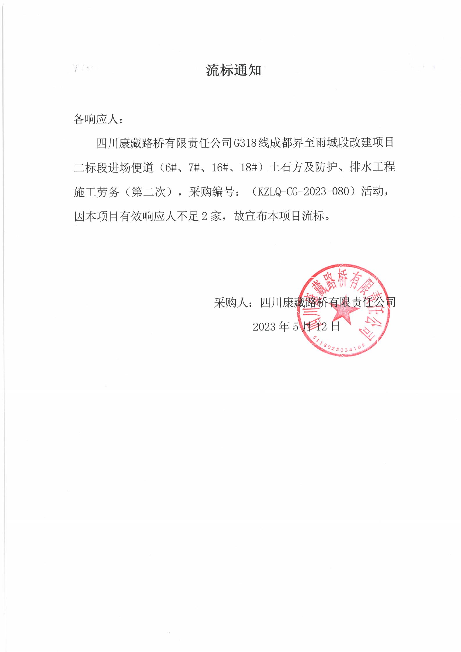四川康藏路橋有限責(zé)任公司G318線成都至雨城段改建項(xiàng)目二標(biāo)段進(jìn)場便道(6#、7#、16#、18#)土石方及防護(hù)、排水工程施工勞務(wù)(第二次)流標(biāo)通知