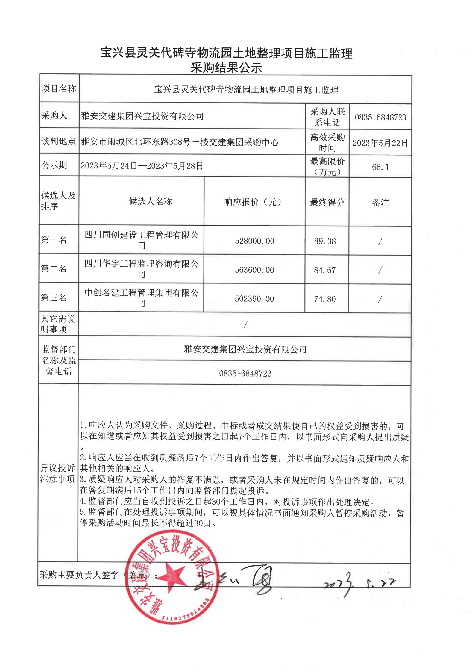 雅安交建集團興寶投資有限公司寶興縣靈關代碑寺物流園土地整理項目施工監(jiān)理采購結(jié)果公示