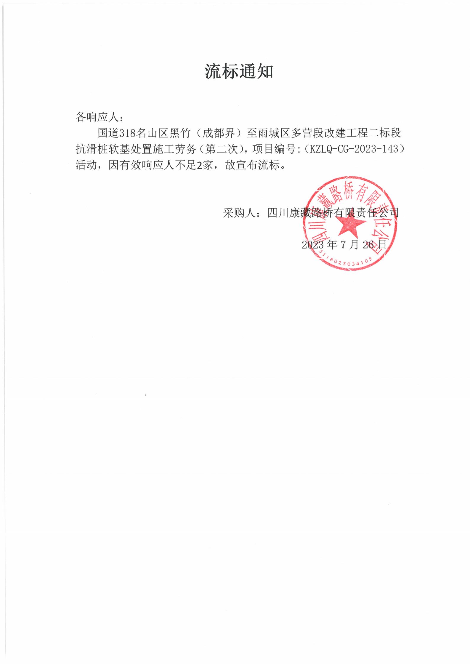 四川康藏路橋有限責(zé)任公司國(guó)道318名山區(qū)黑竹(成都界)至雨城區(qū)多營(yíng)段改建工程二標(biāo)段抗滑樁軟基處置施工勞務(wù)(第二次)流標(biāo)通知