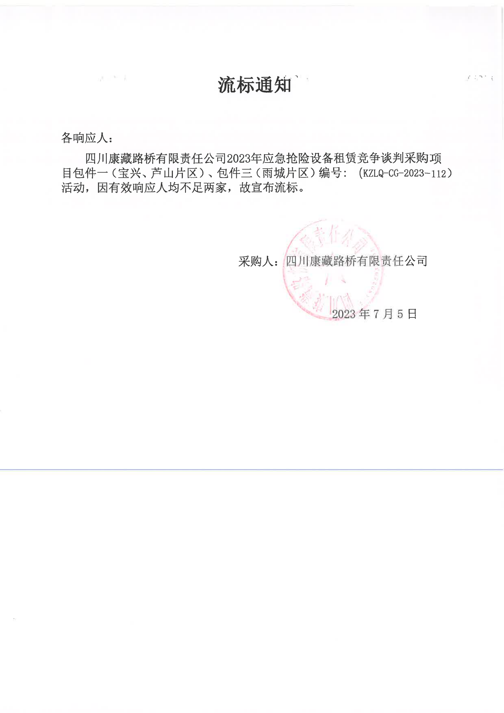 四川康藏路橋有限責任公司2023年應急搶險設備租賃競爭談判采購項目包件一(寶興、蘆山片區(qū))、包件三(雨城片區(qū))流標通知