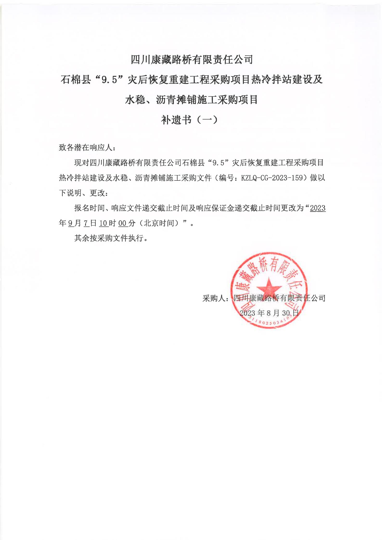 四川康藏路橋有限責(zé)任公司石棉縣“9·5”災(zāi)后恢復(fù)重建工程采購(gòu)項(xiàng)目熱冷拌站建設(shè)及水穩(wěn)、瀝青攤鋪施工采購(gòu)項(xiàng)目補(bǔ)遺書(shū)(一)