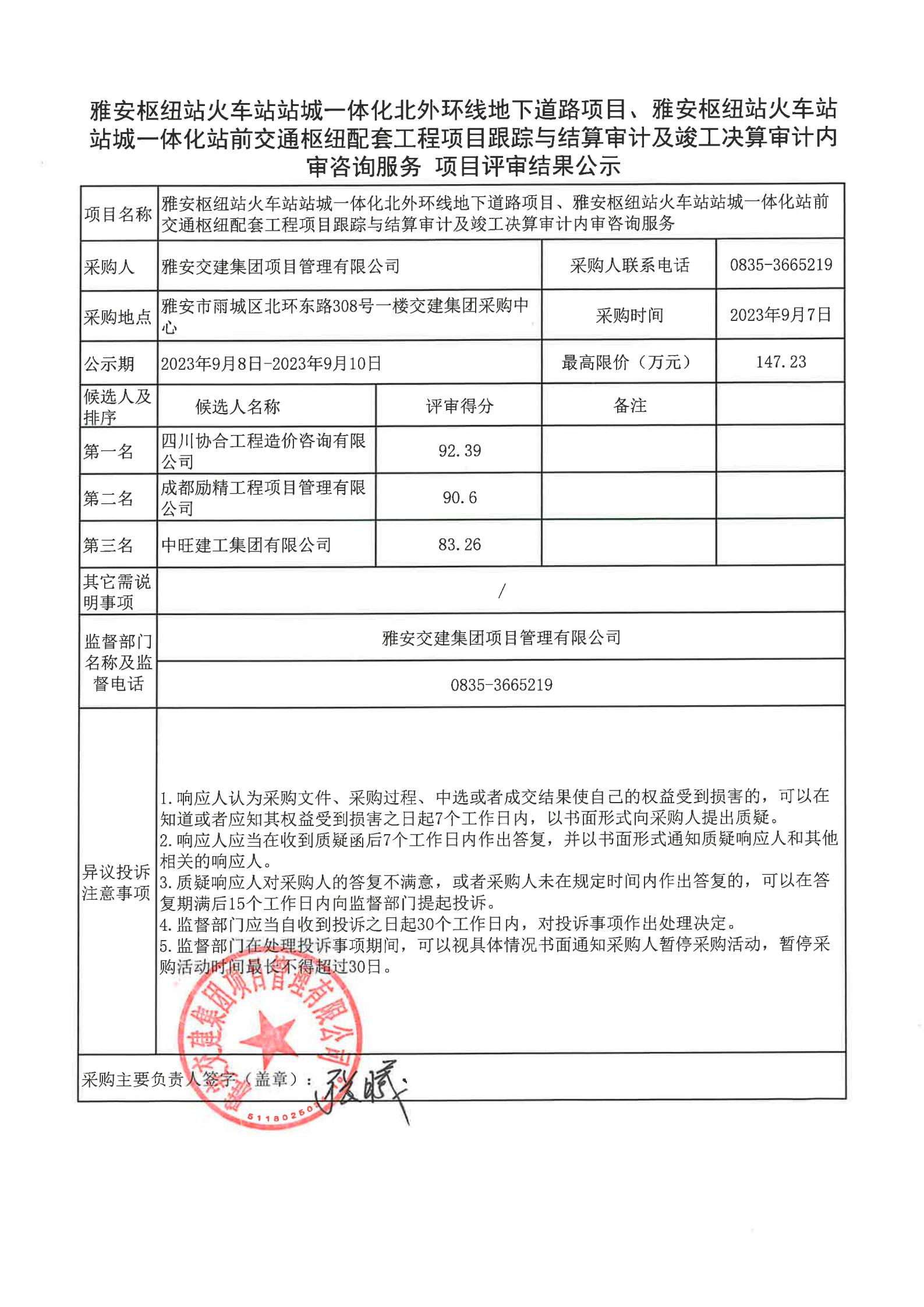 雅安交建集團項目管理有限公司雅安樞紐站火車站站城一體化北外環(huán)線地下道路項目、樞紐站火車站站成一體化站前交通樞紐配套工程項目跟蹤與結算審計及竣工決算審計內審咨詢服務項目評審結果公示