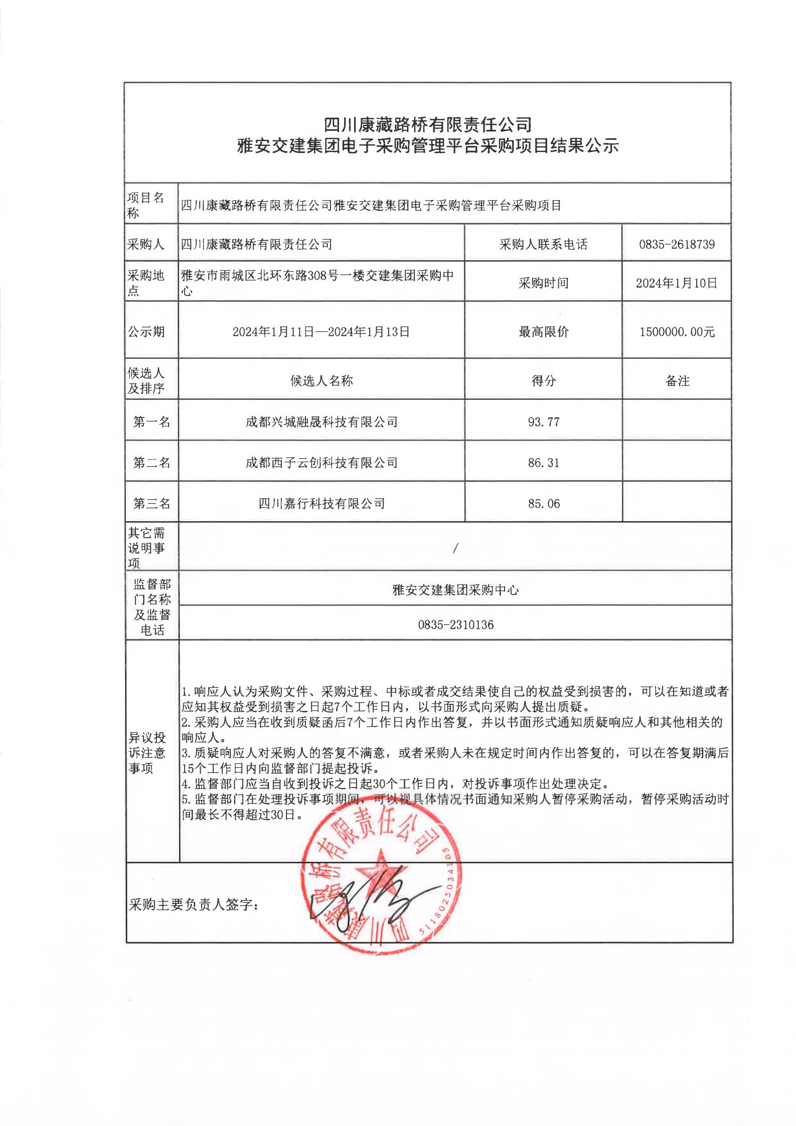 四川康藏路橋有限責(zé)任公司雅安交建集團(tuán)電子采購管理平臺(tái)采購項(xiàng)目結(jié)果公示
