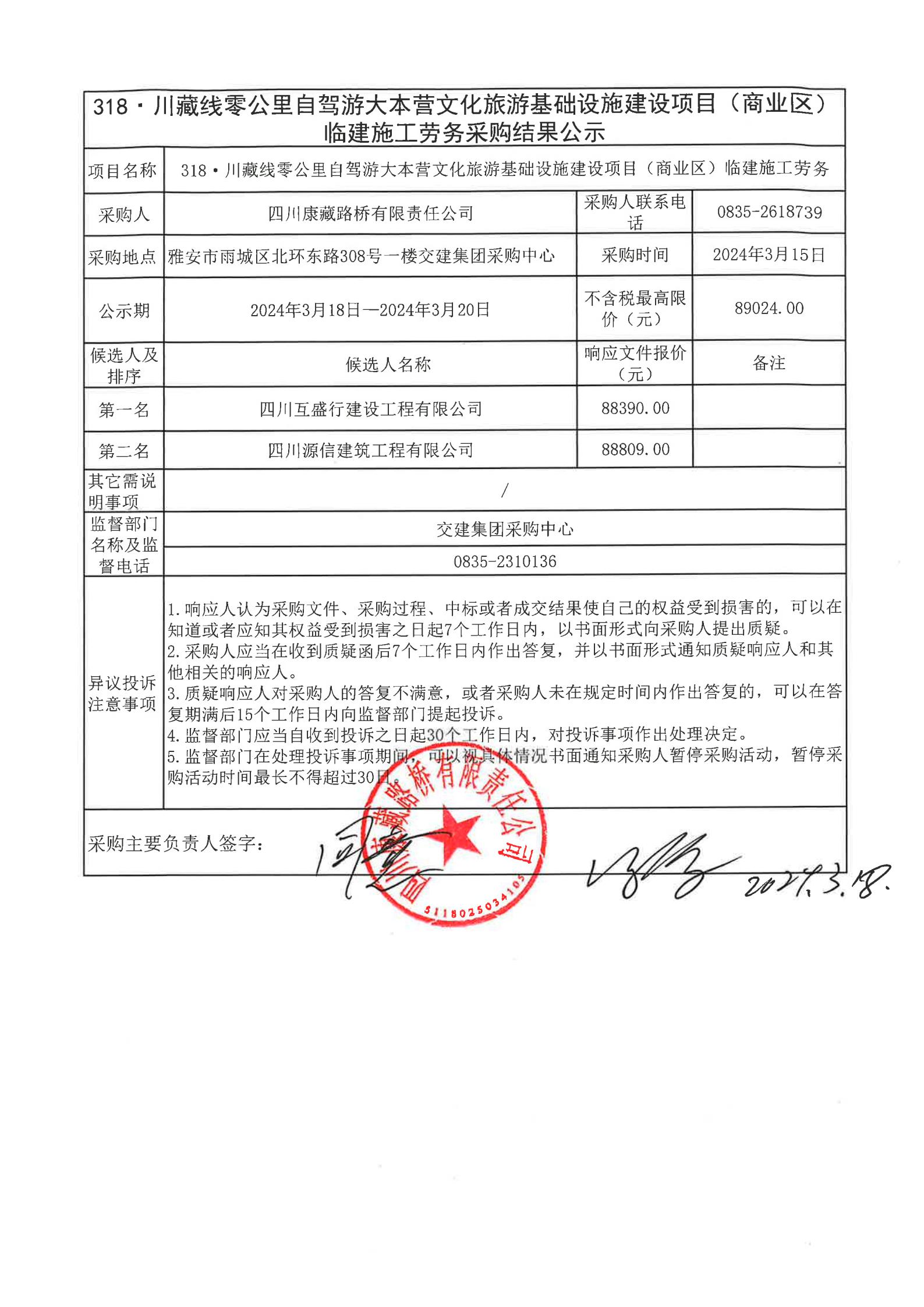 四川康藏路橋有限責(zé)任公司318·川藏線零公里自駕游大本營文化旅游基礎(chǔ)設(shè)施建設(shè)項(xiàng)目(商業(yè)區(qū))臨建施工勞務(wù)結(jié)果公示